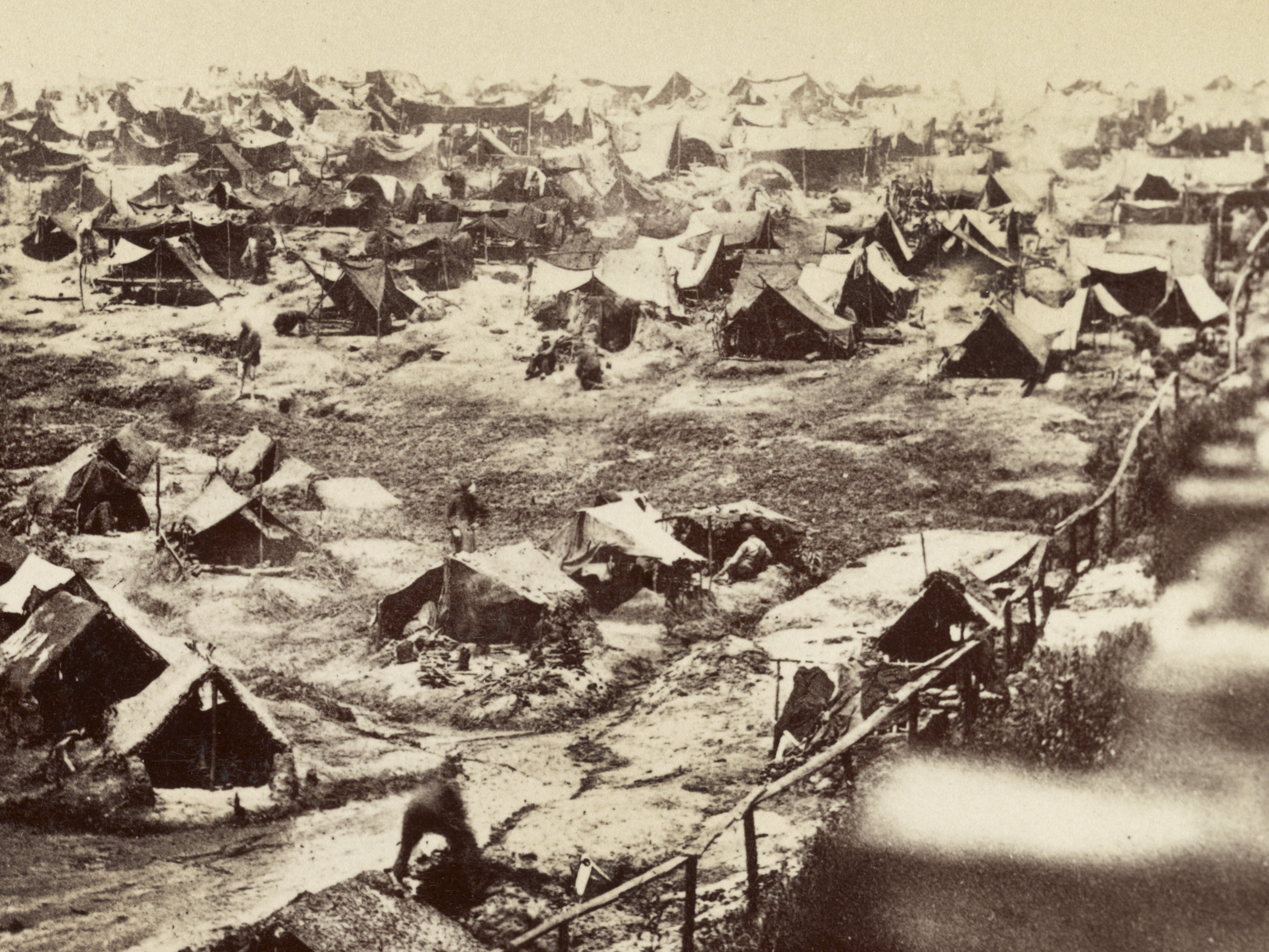 View from a guard tower of soldiers’ shebangs and huts along the deadline at Andersonville 1864