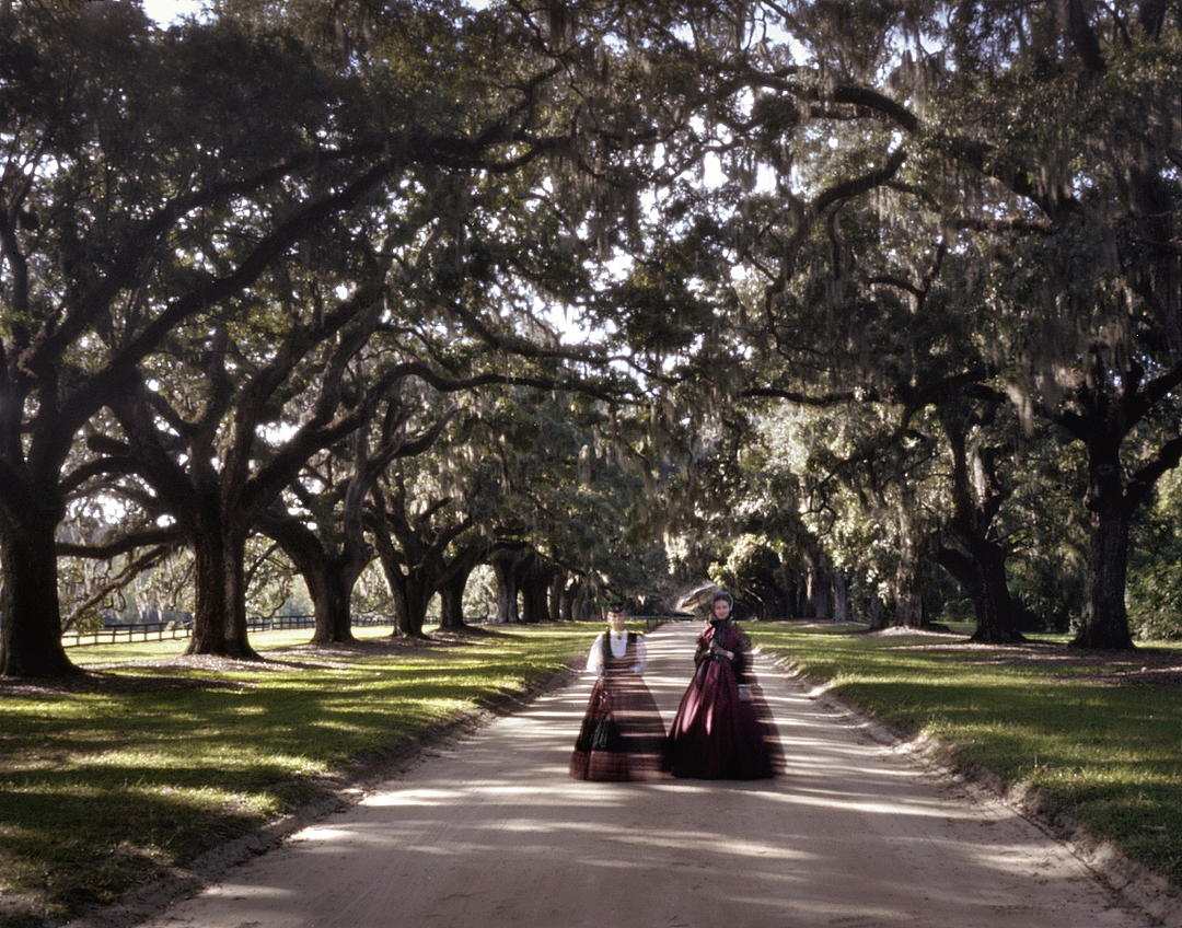 Southern bells, dressed as their fore bearers, stroll beneath the Avenue of Oaks at Boone Hall Plantation, SC 2013