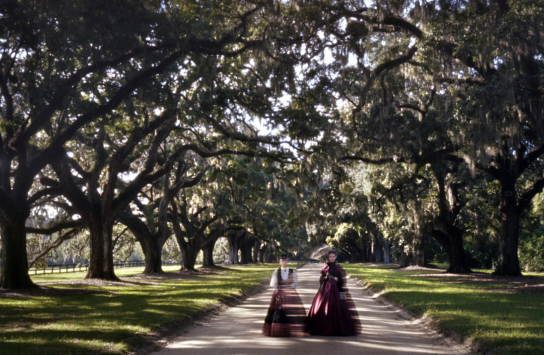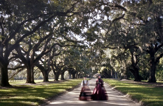 Southern ladies in the impression of their antebellum fore bearers stroll under the “Avenue of Oaks” at Boone Hall Plantation, SC 2013
