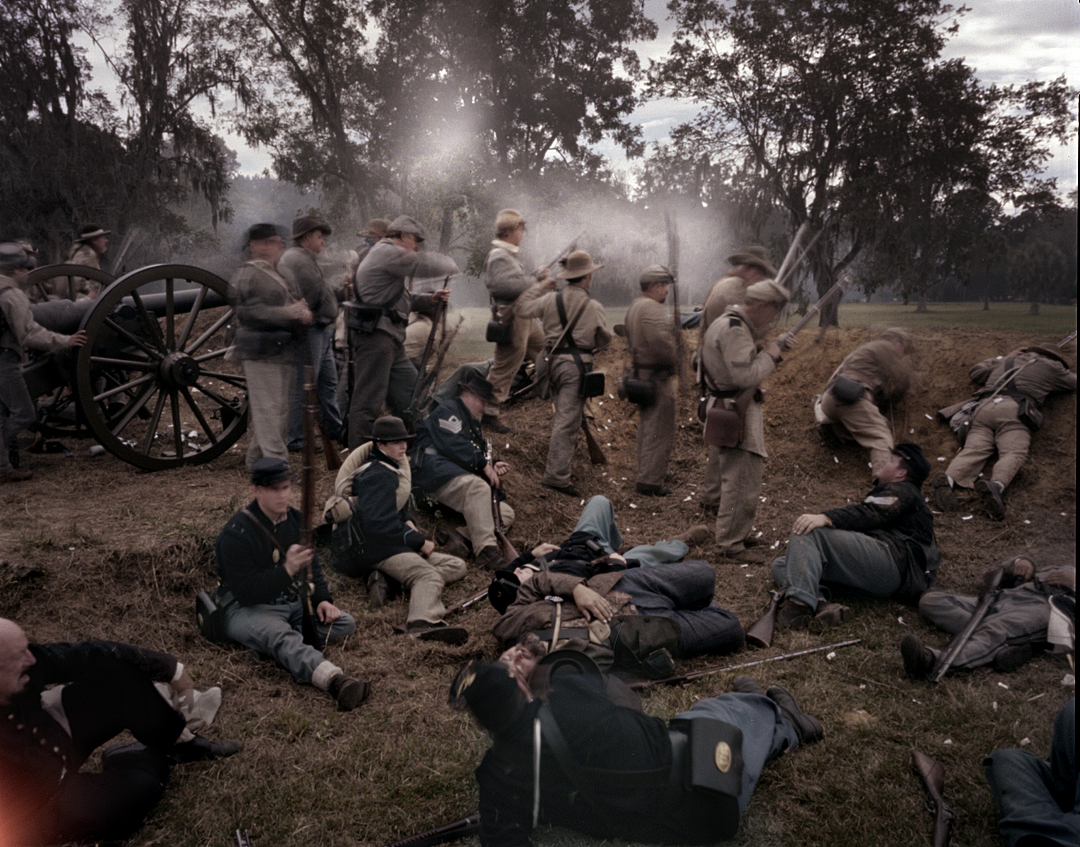 Union reenactors lie wounded in the parapet of Fort Wagner as the battle rages at Boone Hall Plantation, SC 2013Confederate reenactors