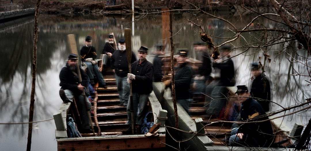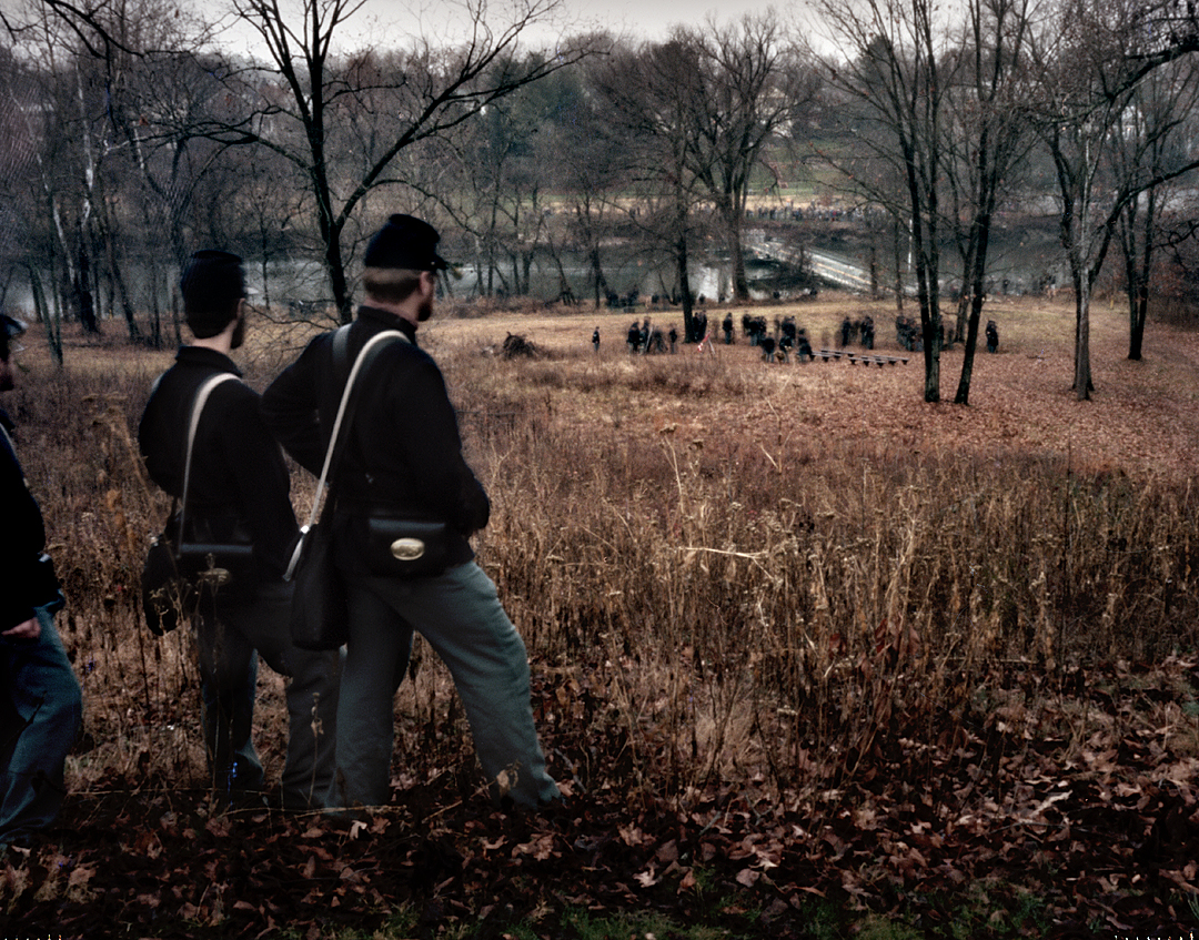 Union re-enactors watch as a pontoon bridge across the Rappahannock is readied during a reenactment of the Battle of Fredericksburg, VA. 2012