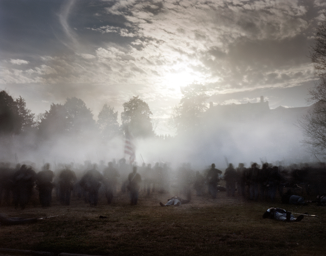 Reenactors march into a wall of gun smoke, Fredericksburg, Va 2012
