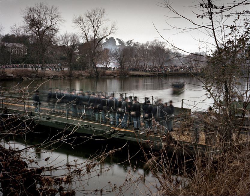 Union re-enactors cross the Rappahannock River via pontoon bridge during reenactment in Fredericksburg, Va 2012