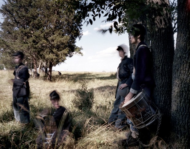 Drummer boys seek the shade during a reenactment of the Battle of Gettysburg. 2013