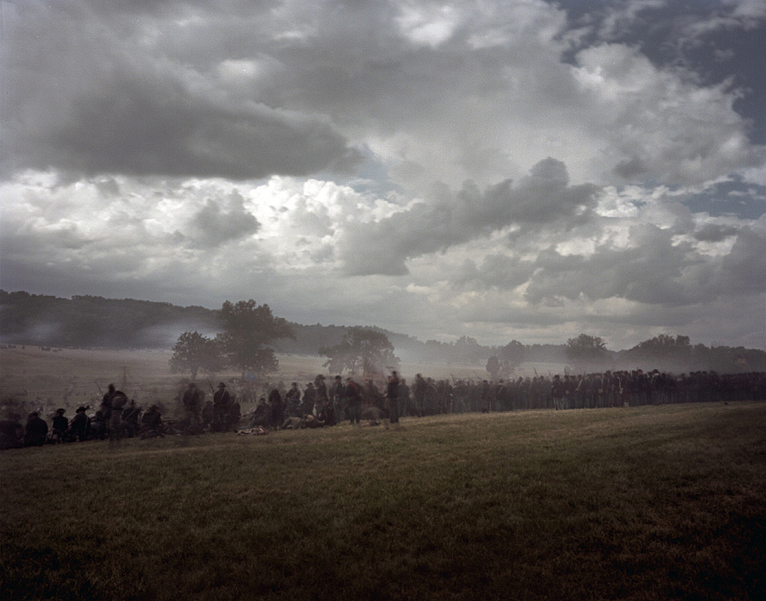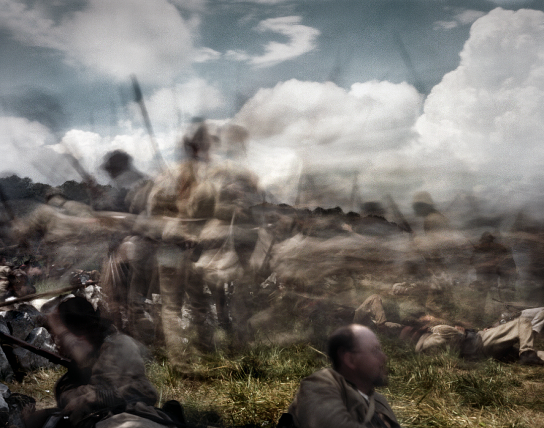 I eventually marched out with these troops and participated in this 150th anniversary of Pickett’s Charge attacking with the Confederate reenactors toward their destiny at Cemetery Ridge on the Bushey Farm.  The experience was mind-numbing in a way, loud, confusing, and desperate as I fought the urge to photograph everything.  With only a few frames of film left I made an effort to reach the rock wall at Cemetery Ridge.  I finally fell there, at the rock wall, literally in the shade of a copse of trees, and took my last image from this perspective.