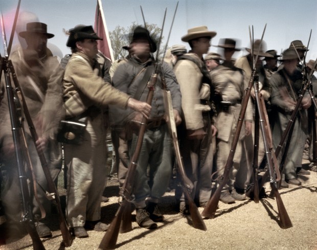 Confederate soldiers stack their arms at the 150th anniversary of the surrender at Appomattox, Va