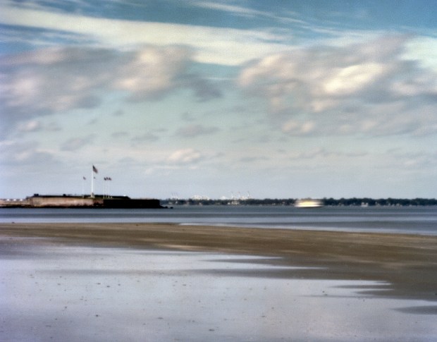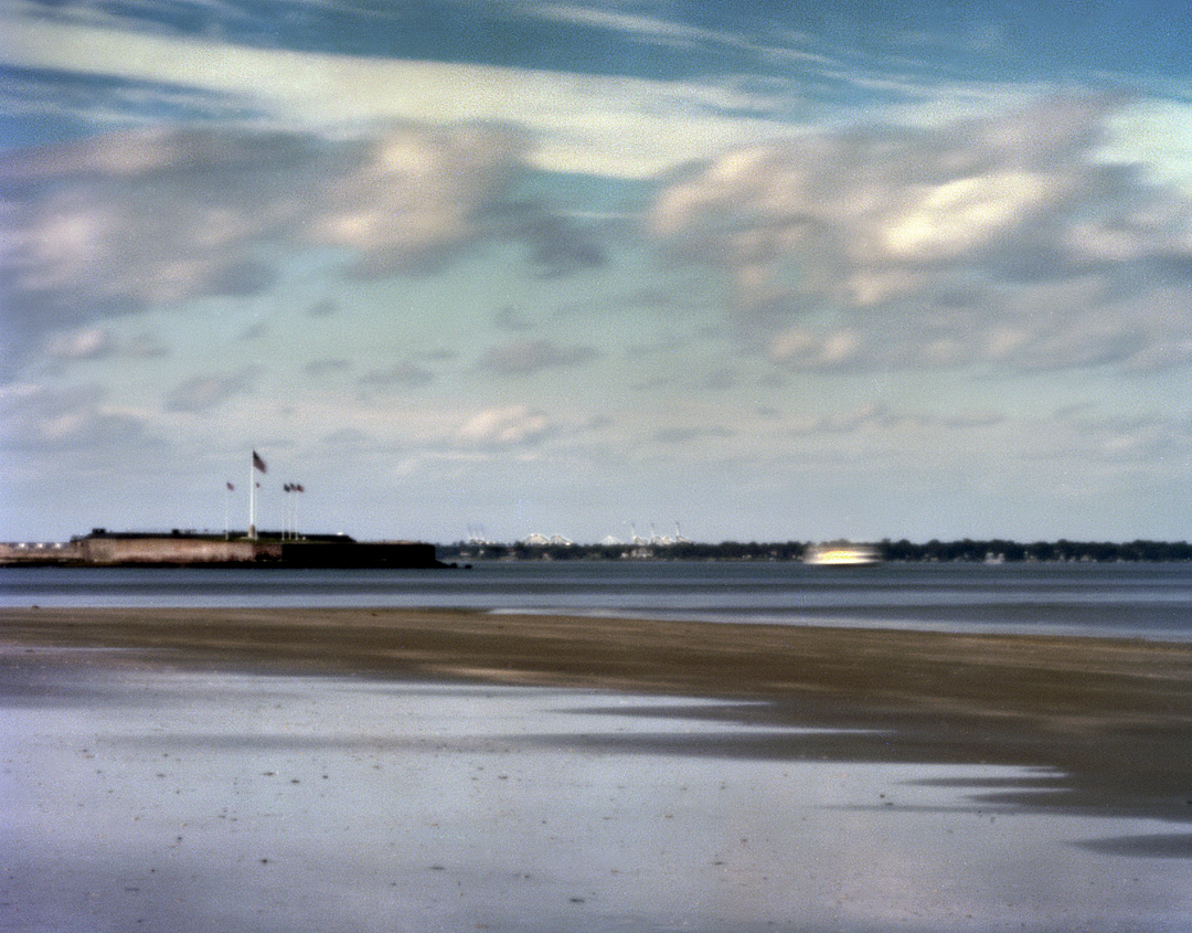 From Morris Island the Stars and Stripes flies over Fort Sumter in Charleston Harbor, South Carolina