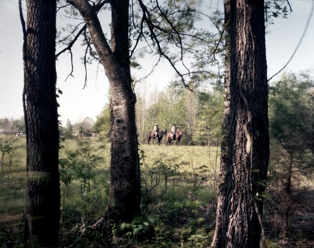 Re-enactors on horseback survey the battlefield during a reenactment of the Battle of Shiloh, Michie, TN. 2012