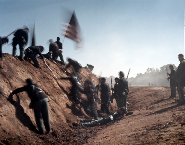 Union reenactors scale the parapet of Fort Harrsion in commemoration of a battle fought during the Siege of Petersburg in 1864-1865