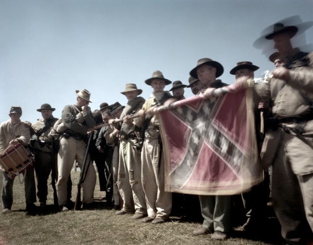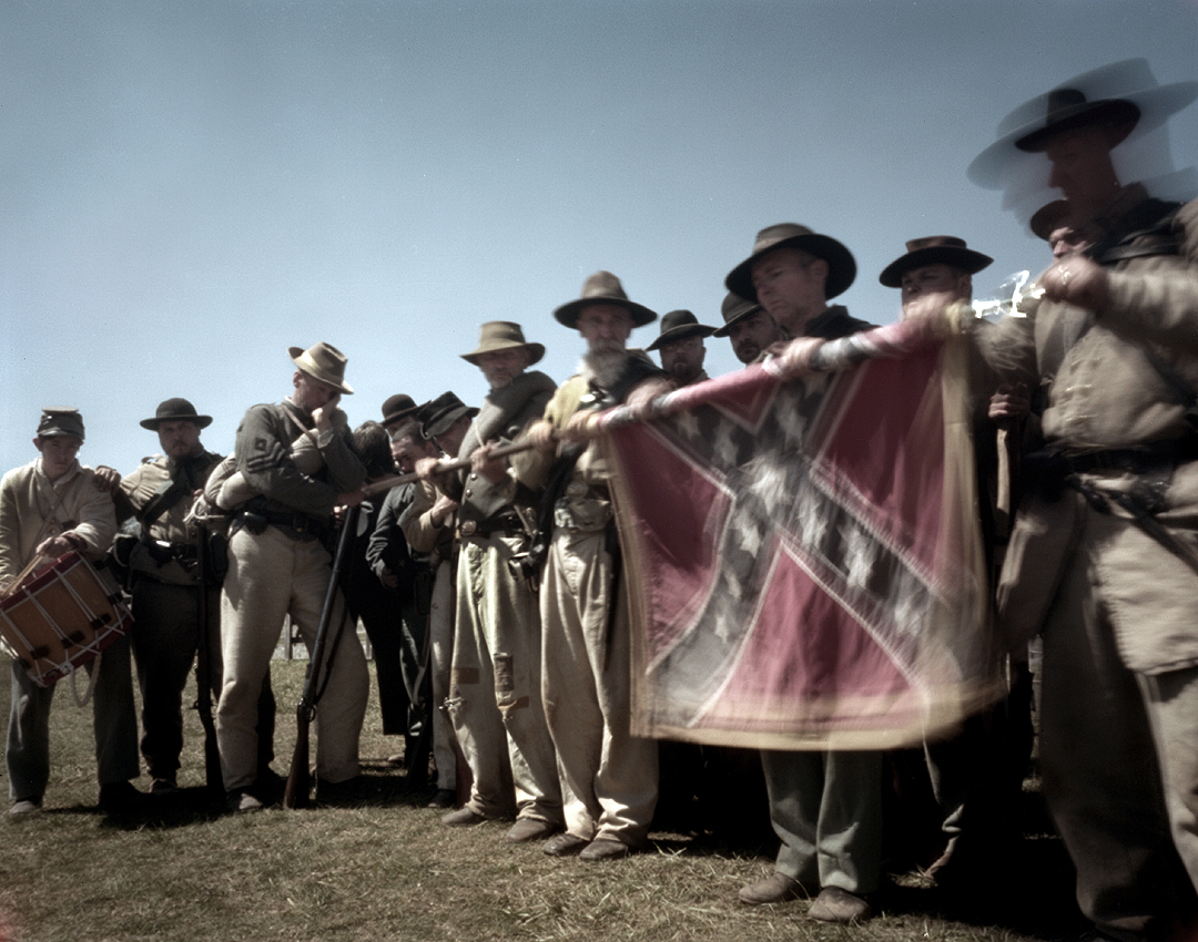 Members of the 4th Texas role up their battle flag in the surrender ceremony at Appomattox