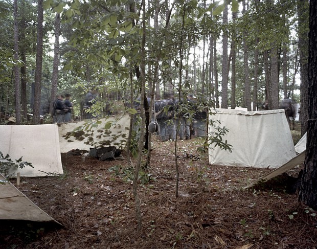Union reenactors in Resaca bivouac in the forest forgoing the standard tent and sleep under tent-flies tied to trees and saplings