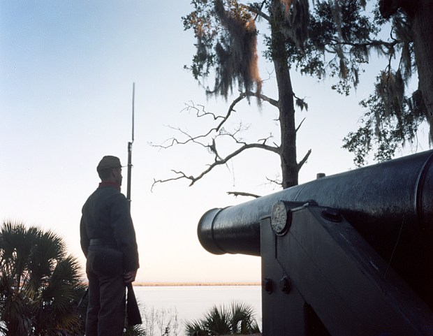 Reenactor stands sentry at Fort McAllister looking to the opposite bank of the Ogeechee River where the Union Navy anchored their ironclads to bombard the in 1863