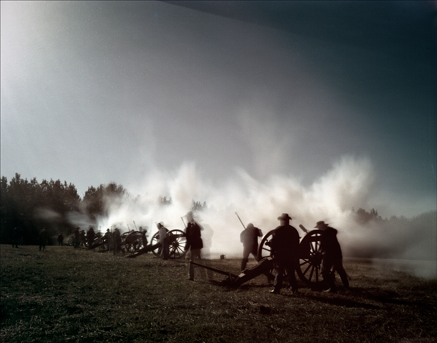 The fighting at Raymond in 1862 centered around Fourteen Mile Creek, a small waterway that bisects the town. The reenactment battle began in a fight along this same creek. Standing with the pinhole cameras in the center of this waterway while re-enactors traded shots across the creek was a moving experience. At one point, deep down in the creek, I could only see the ends of each sides opposing muskets, spitting out fire and smoke. The “battle” raged on each side of the creek, going back and forth, troops splashing into the creek, with gun smoke backlit in the trees…