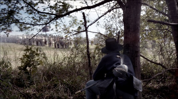 Union sharpshooter takes cover in a tree line during a reenactment of the Battle of Vicksburg in Raymond, MS. 2012